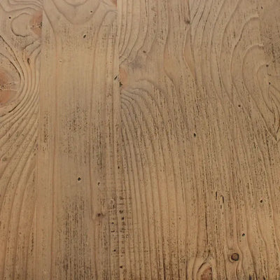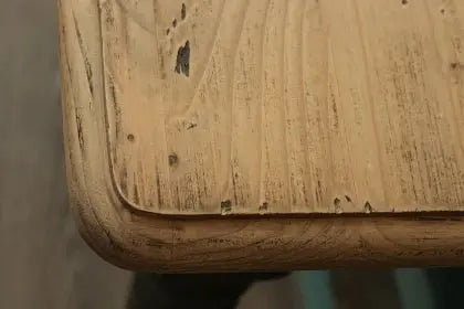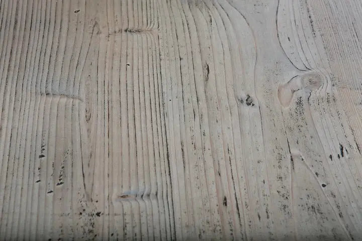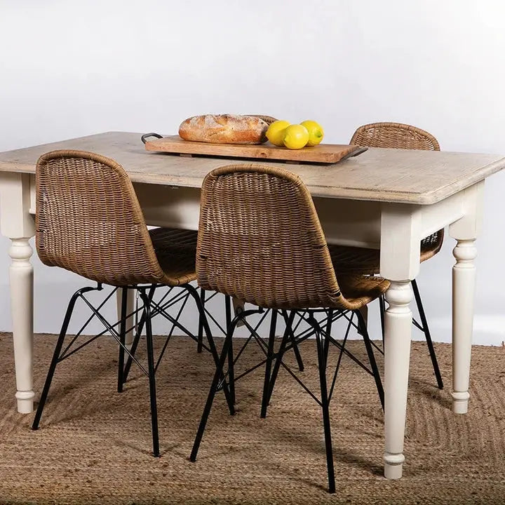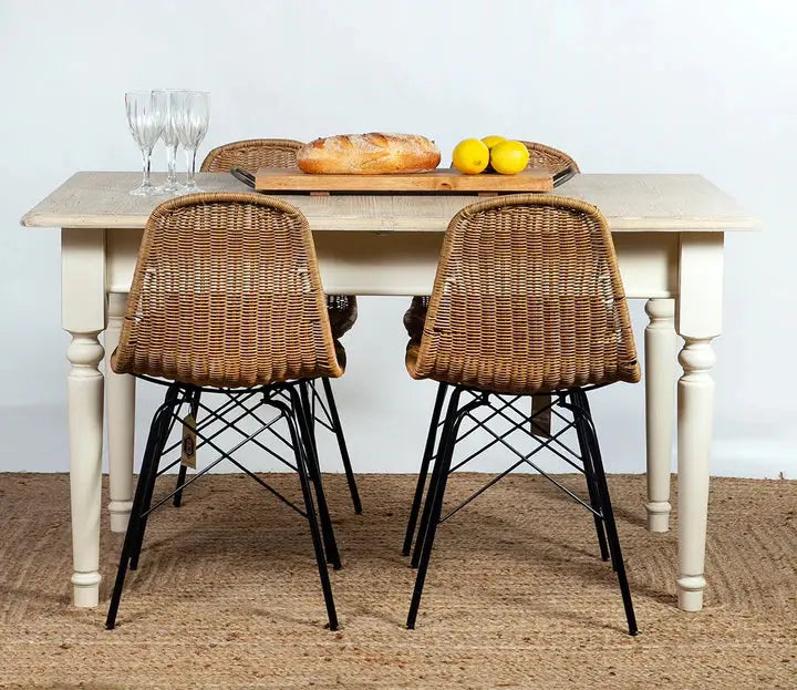 שולחן אוכל יפהפה בסגנון כפרי, פלטת השולחן עשויה מעץ אורן פיני עם רגלי עץ בצבע שמנת