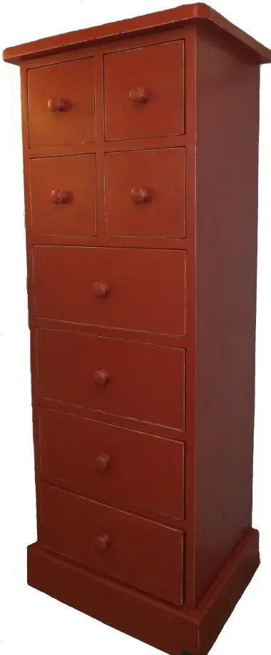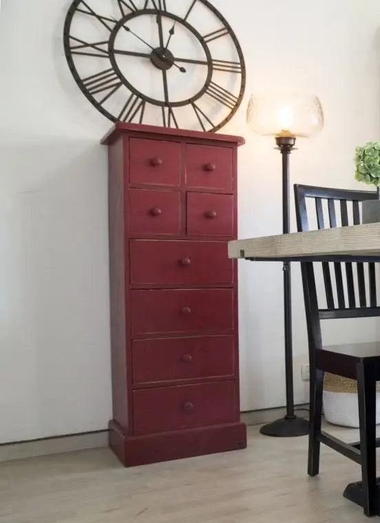 ארונית אחסון עשויה עץ אורן פיני מלא בעיצוב כפרי צרפתי. שידת מגירות מצוינת למשרד או חללים אחרים לאחסון בבית. צבע Antique Red