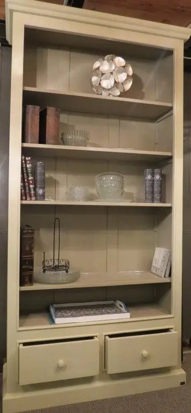 כוננית מדפים עשויה מעץ מלא בסגנון פרובנס הצרפתי (סגנון כפרי צרפתי) בעלת 5 מדפים ו- 2 מגירות נשלפות בחלק התחתון.