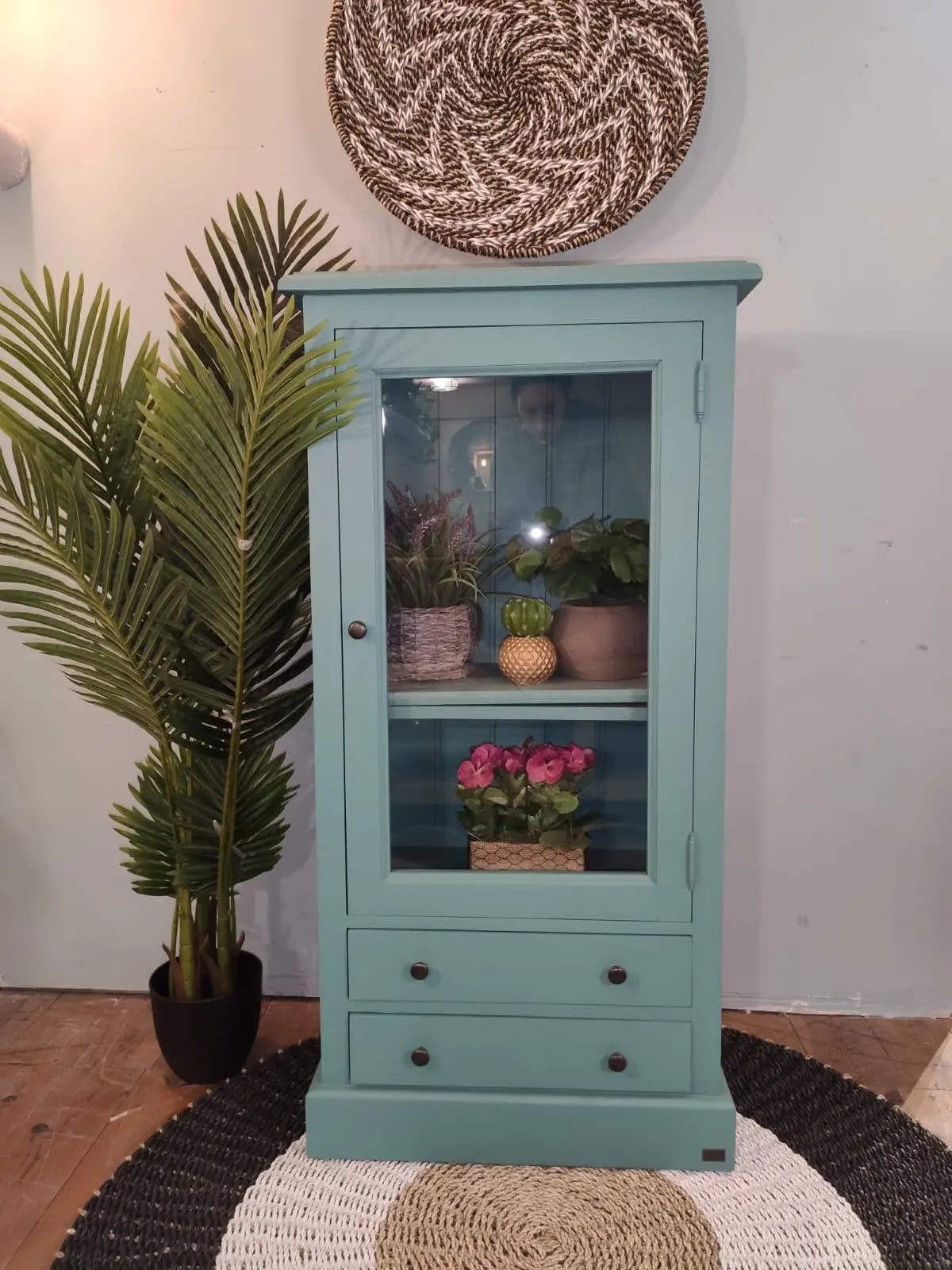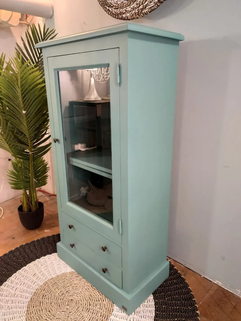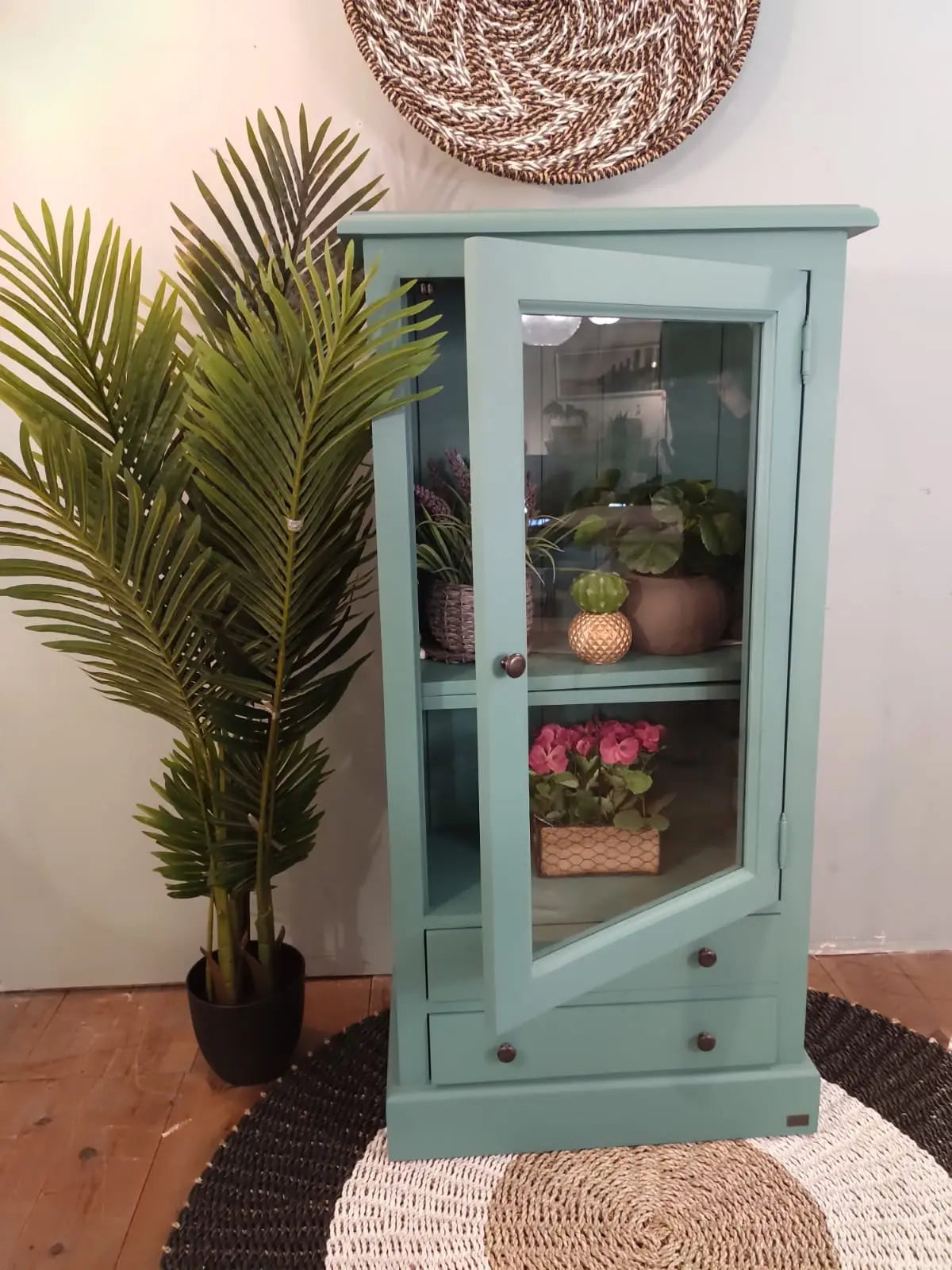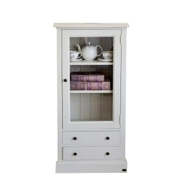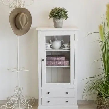 ויטרינה זכוכית מעץ מלא מעוצבת בסגנון פרובנס. בגלל גובהה הנמוך, מתאימה הויטרינה למבואות ונישות בבית.